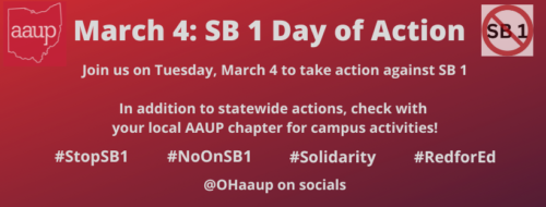 On Tuesday, March 4, AAUP chapters across the state will engage in various activities to raise awareness about and push back on SB 1, “The Higher Education Destruction Act.” Look for information from your AAUP local to see how you can get involved.